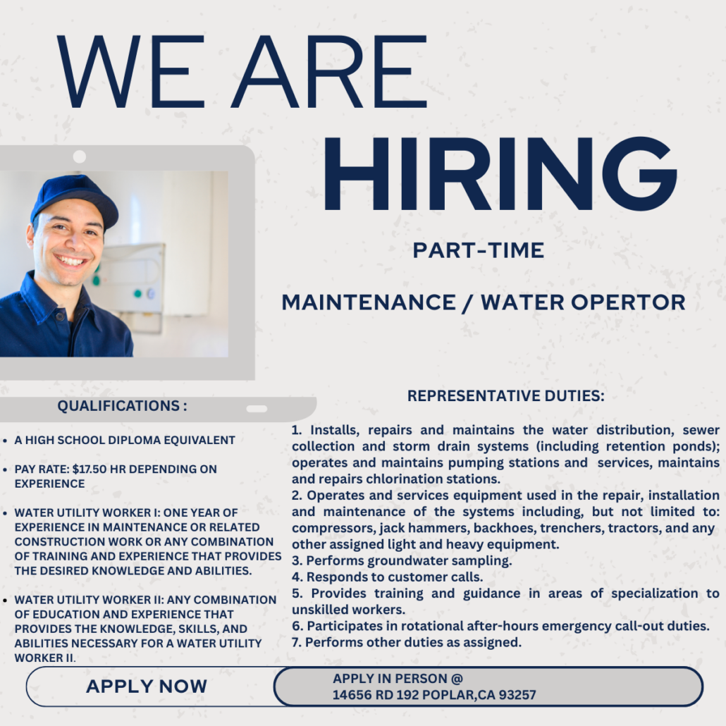Applications may be faxed, e-mailed, mailed or hand delivered to POPLAR COMMUNITY SERVICE DISTRICT. Applicants who choose to fax or e-mail their employment application must also submit an original, signed application.